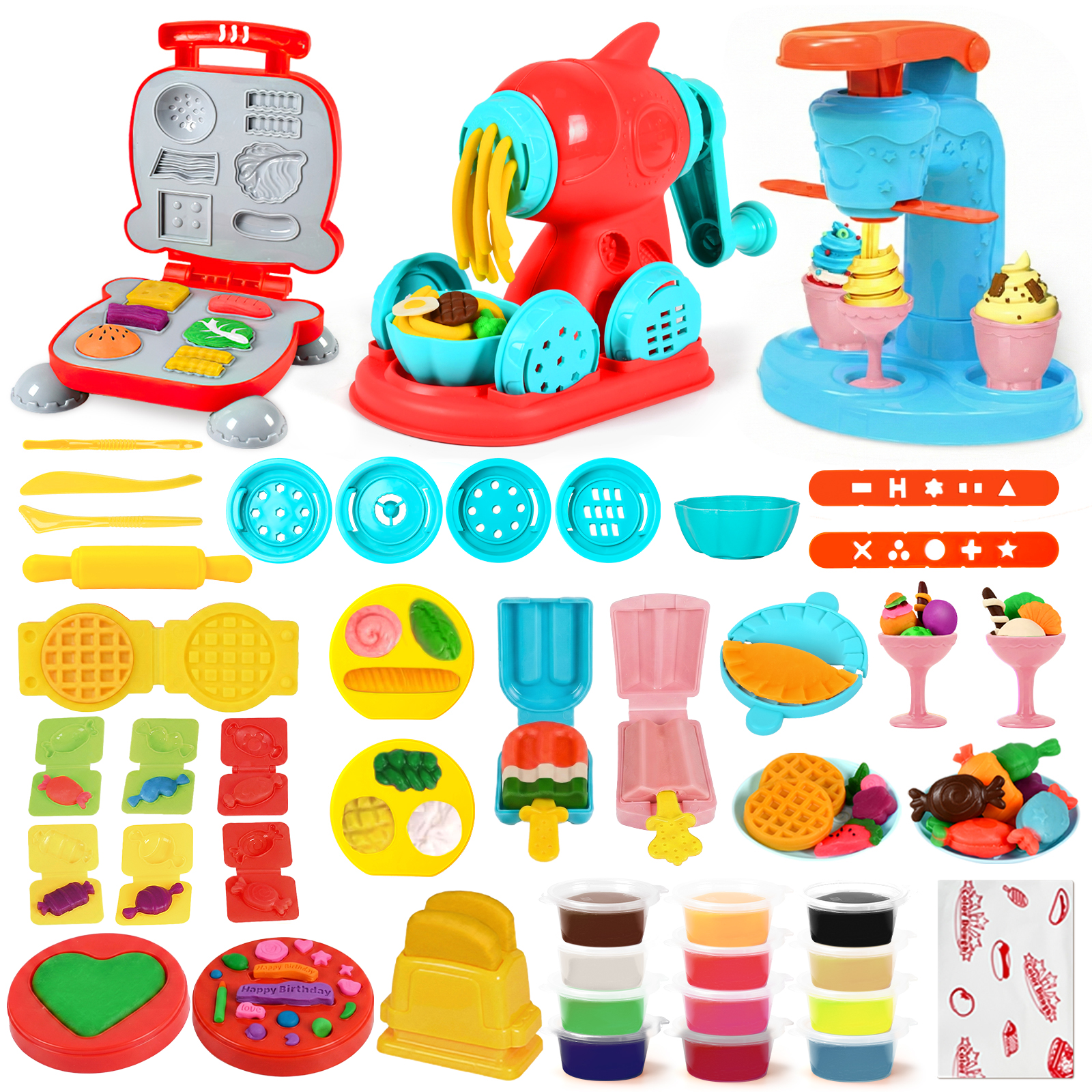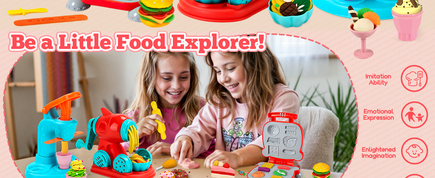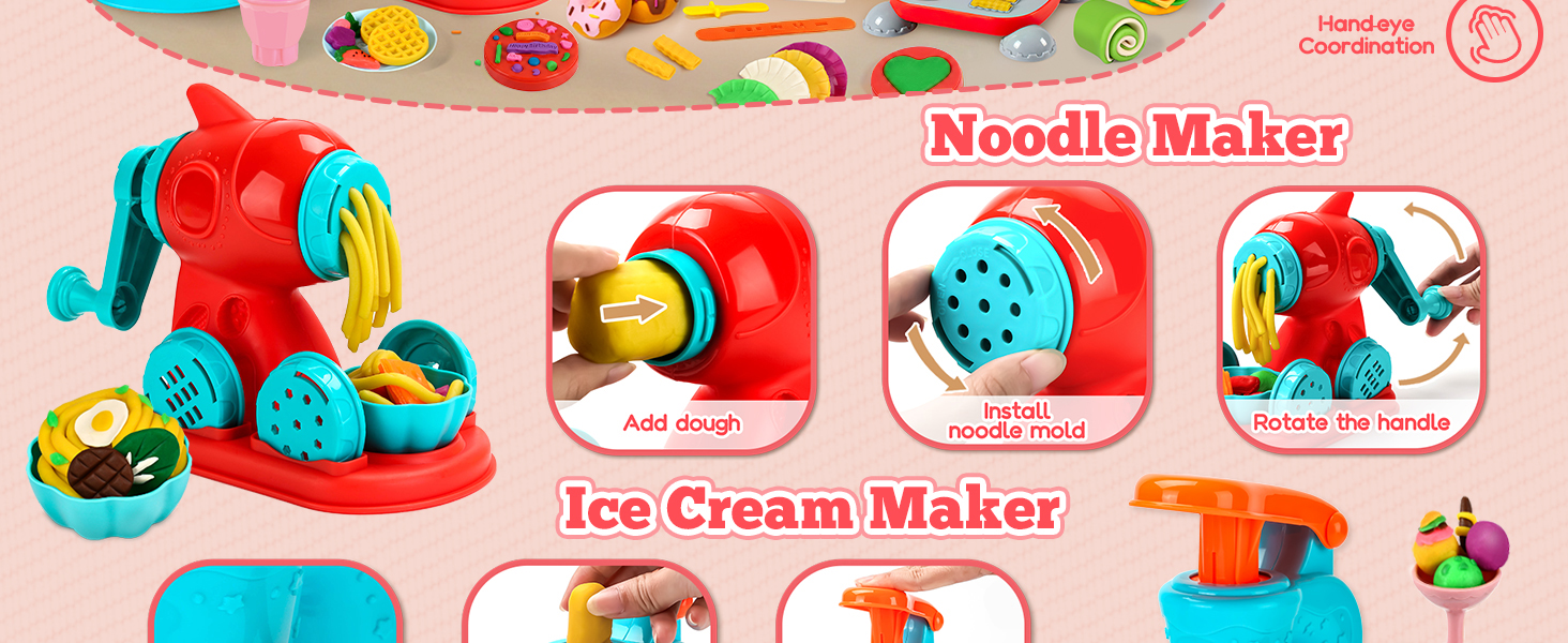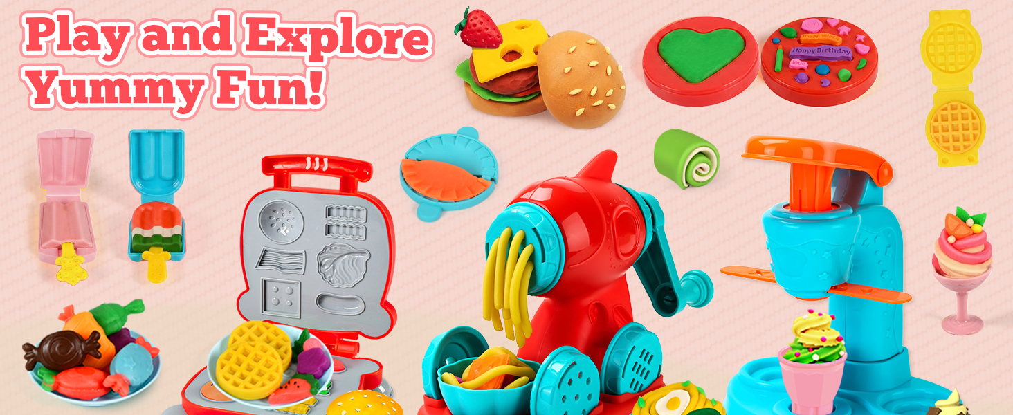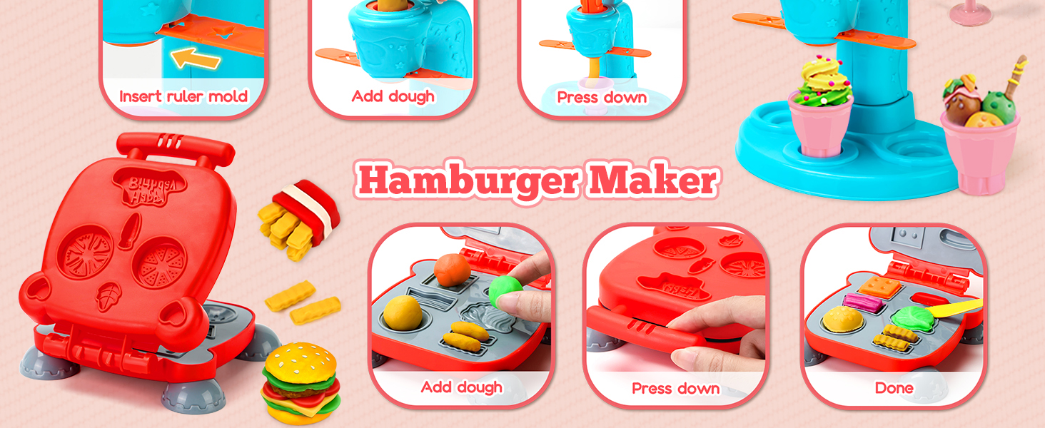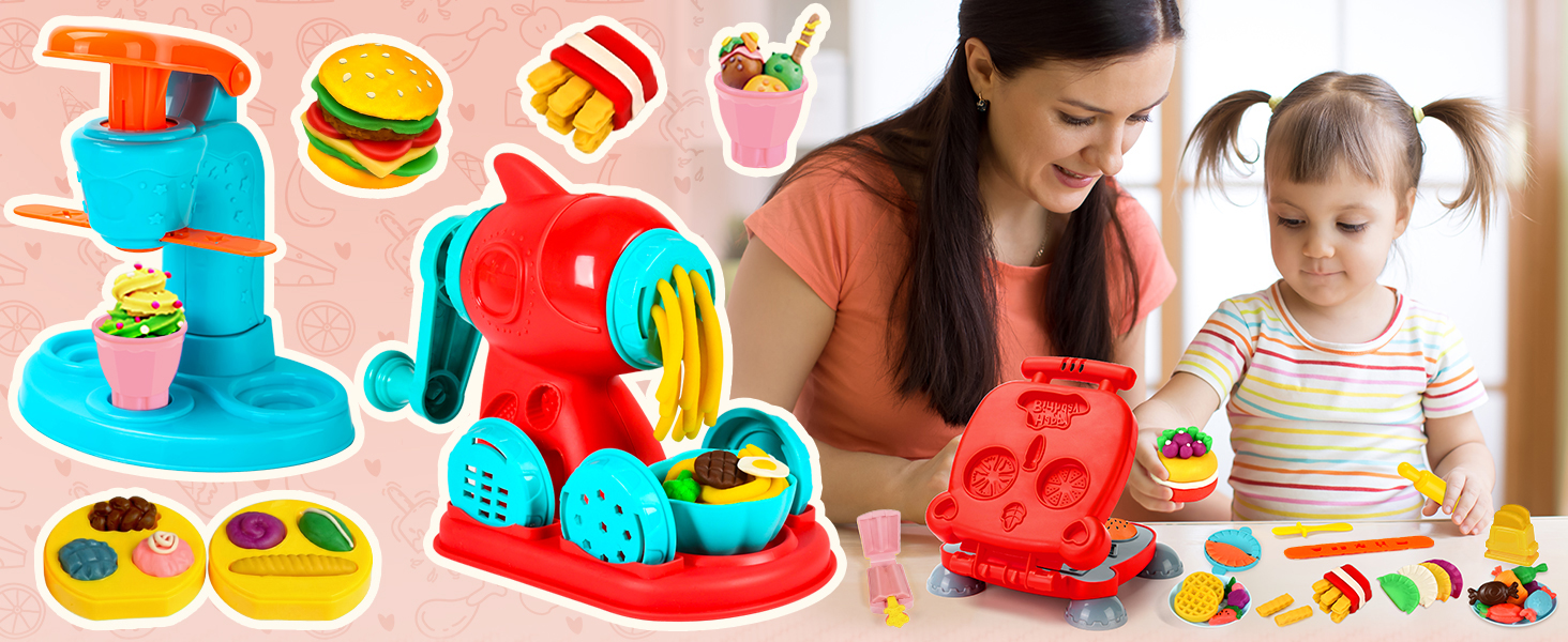 - Accessory Variety: Includes 59 PCS, featuring an ice cream maker, noodle machine, burger maker, a wide array of accessories and 12 dough in random colors. Little chefs can unleash their imagination and manage their own unique restaurant