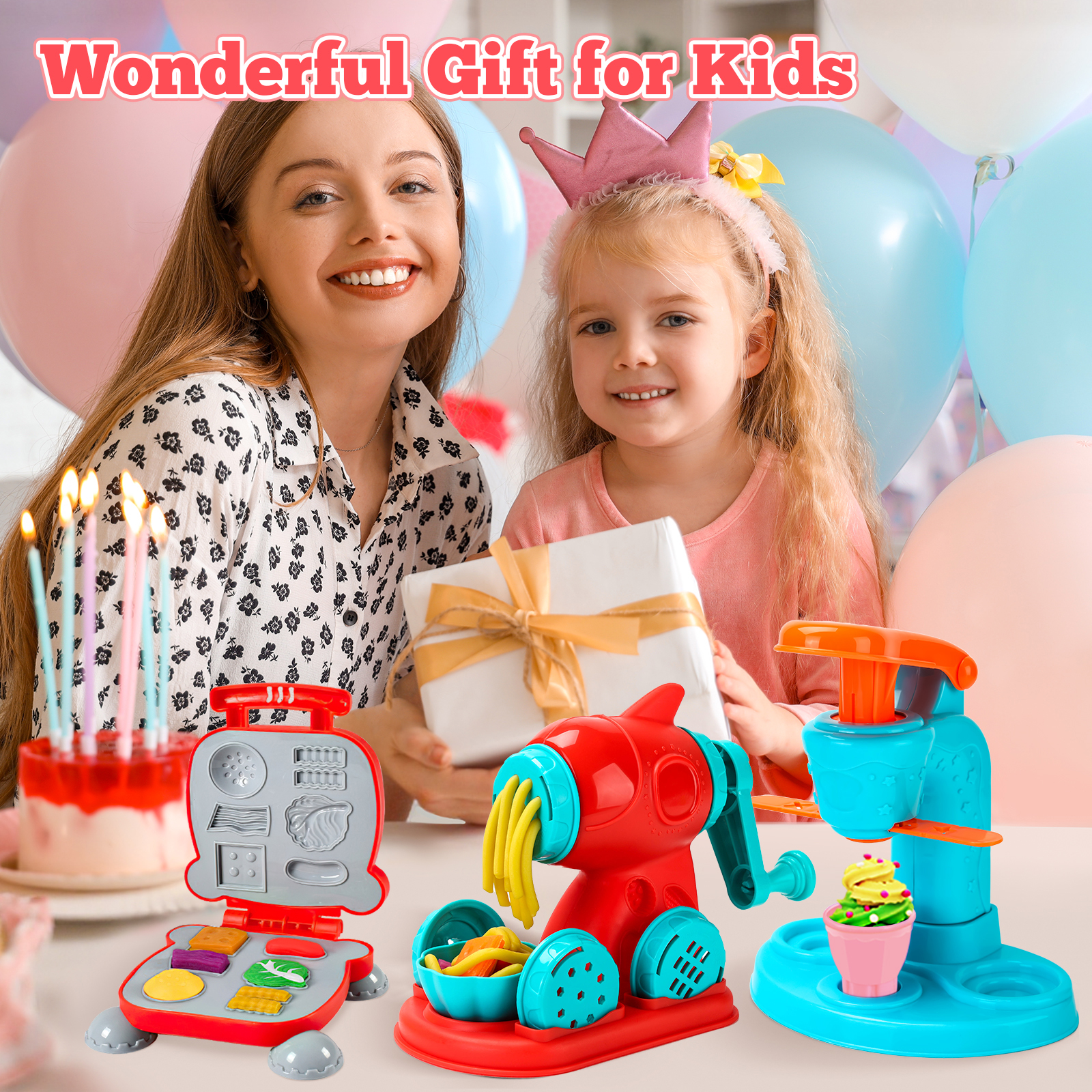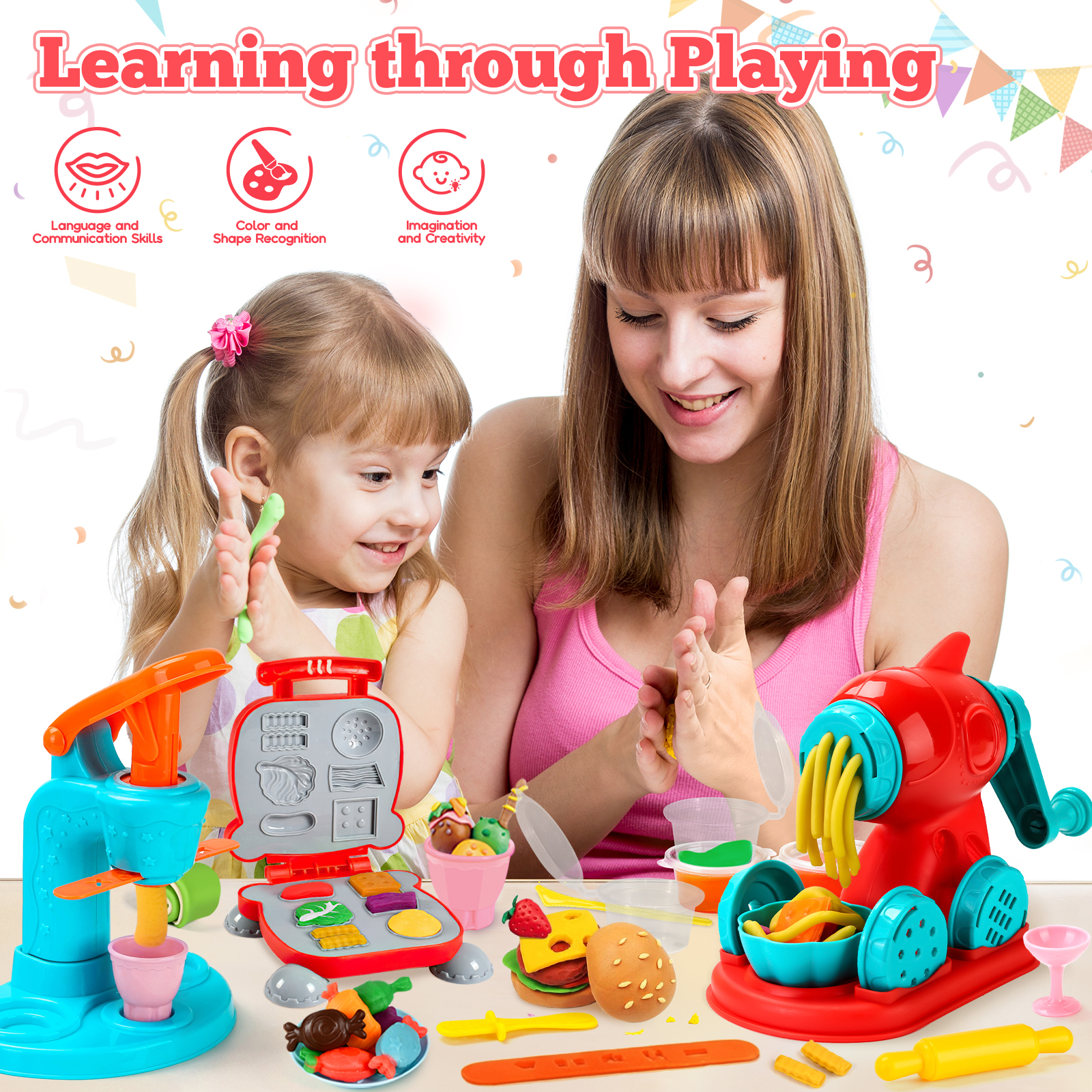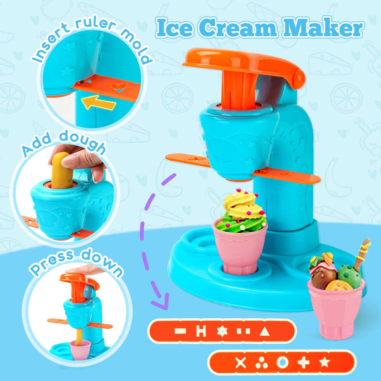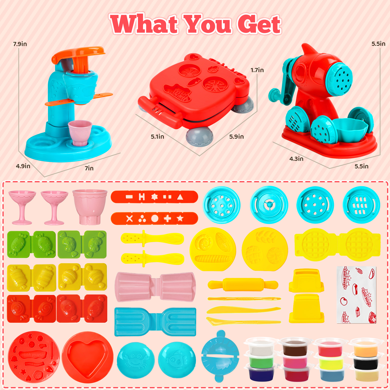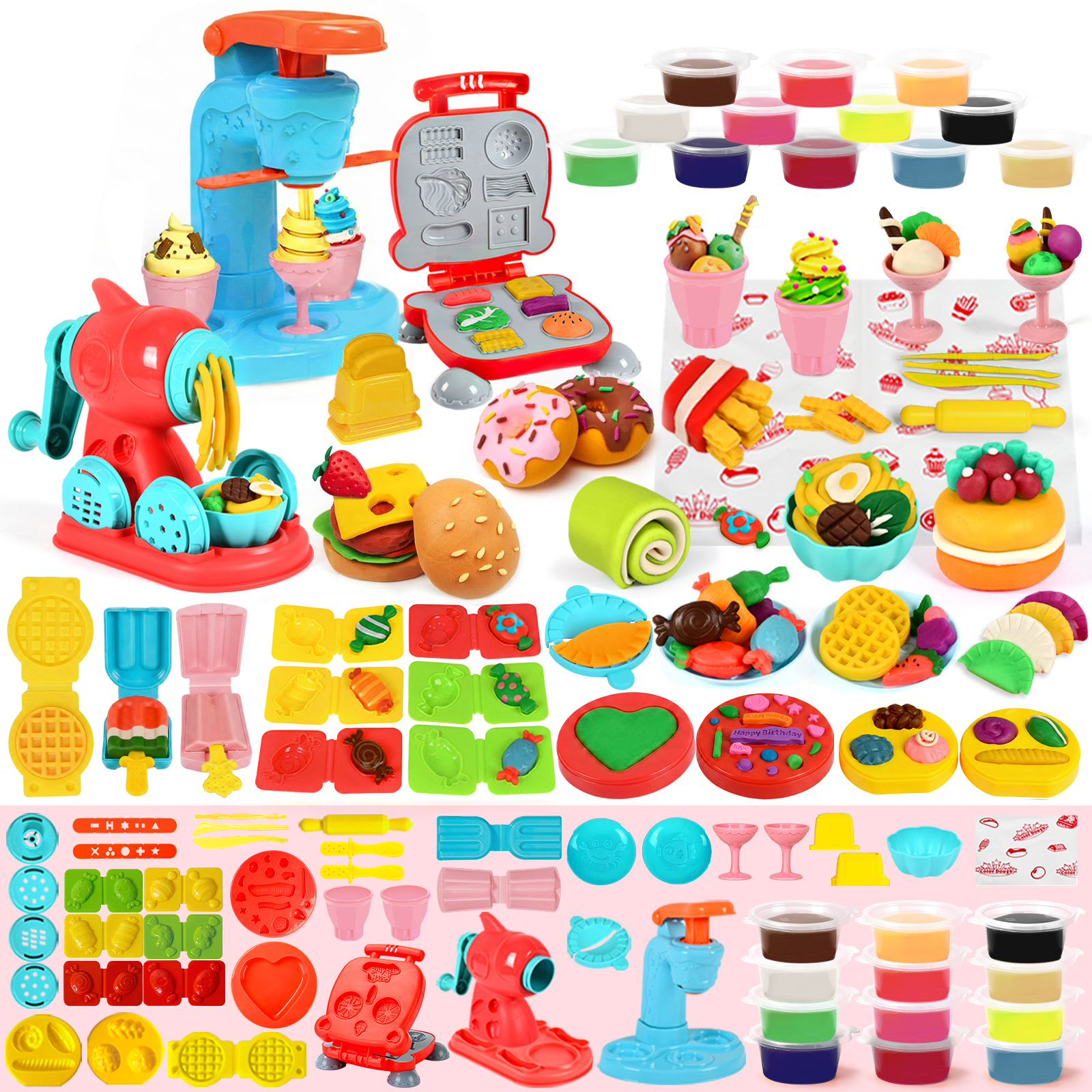 - Accessory Variety: Includes 59 PCS, featuring an ice cream maker, noodle machine, burger maker, a wide array of accessories and 12 dough in random colors. Little chefs can unleash their imagination and manage their own unique restaurant