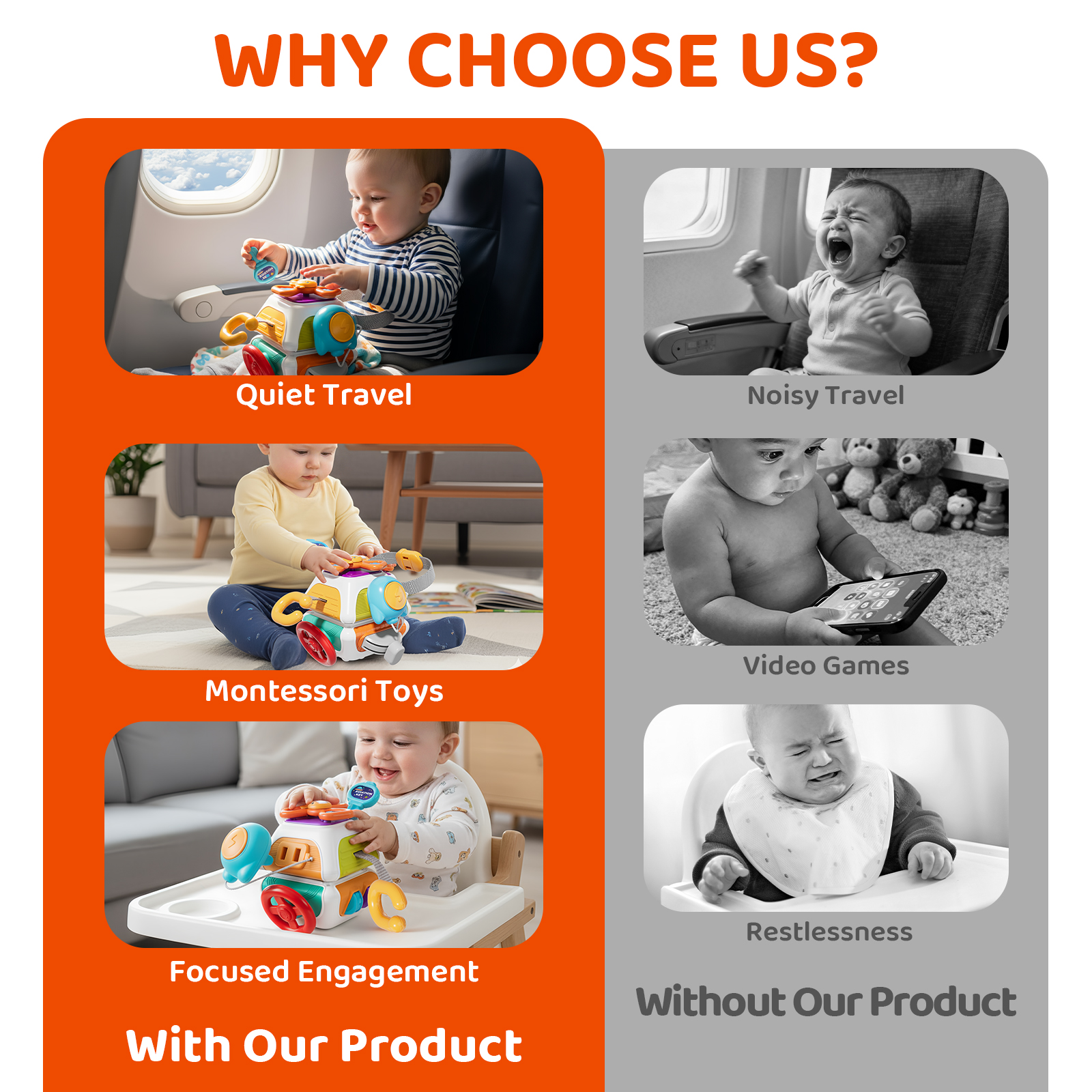 Foster independence and practical life skills through play! Our Montessori toys include real-world simulations such as using a key to unlock a door, fastening a seatbelt, and operating a gear shift. These activities build confidence and prepare your child for daily routines in a fun, engaging way