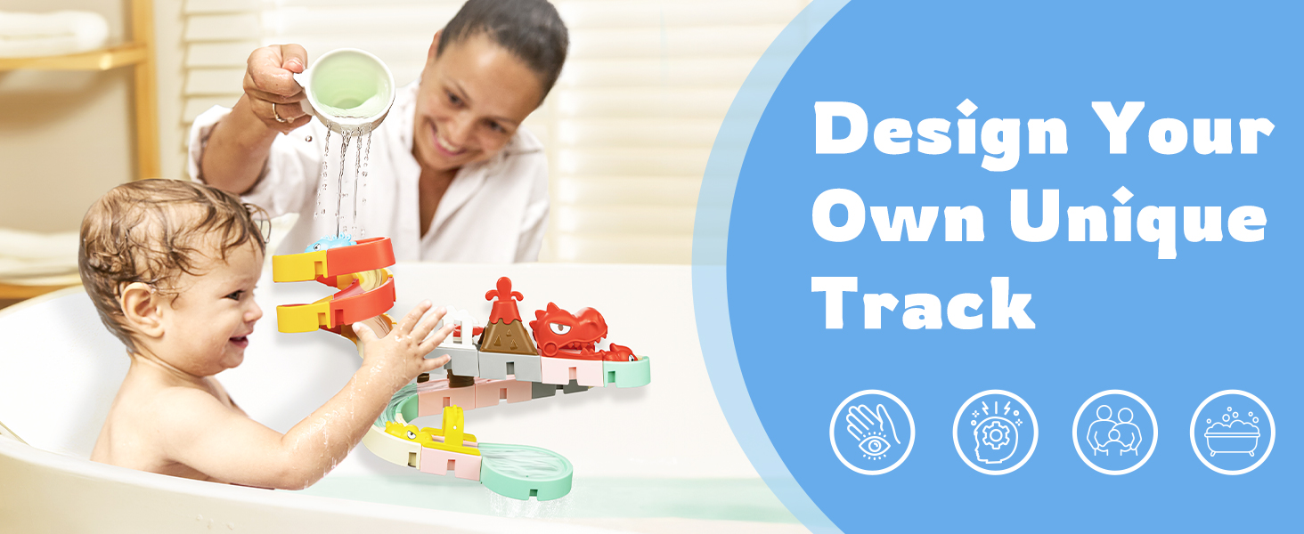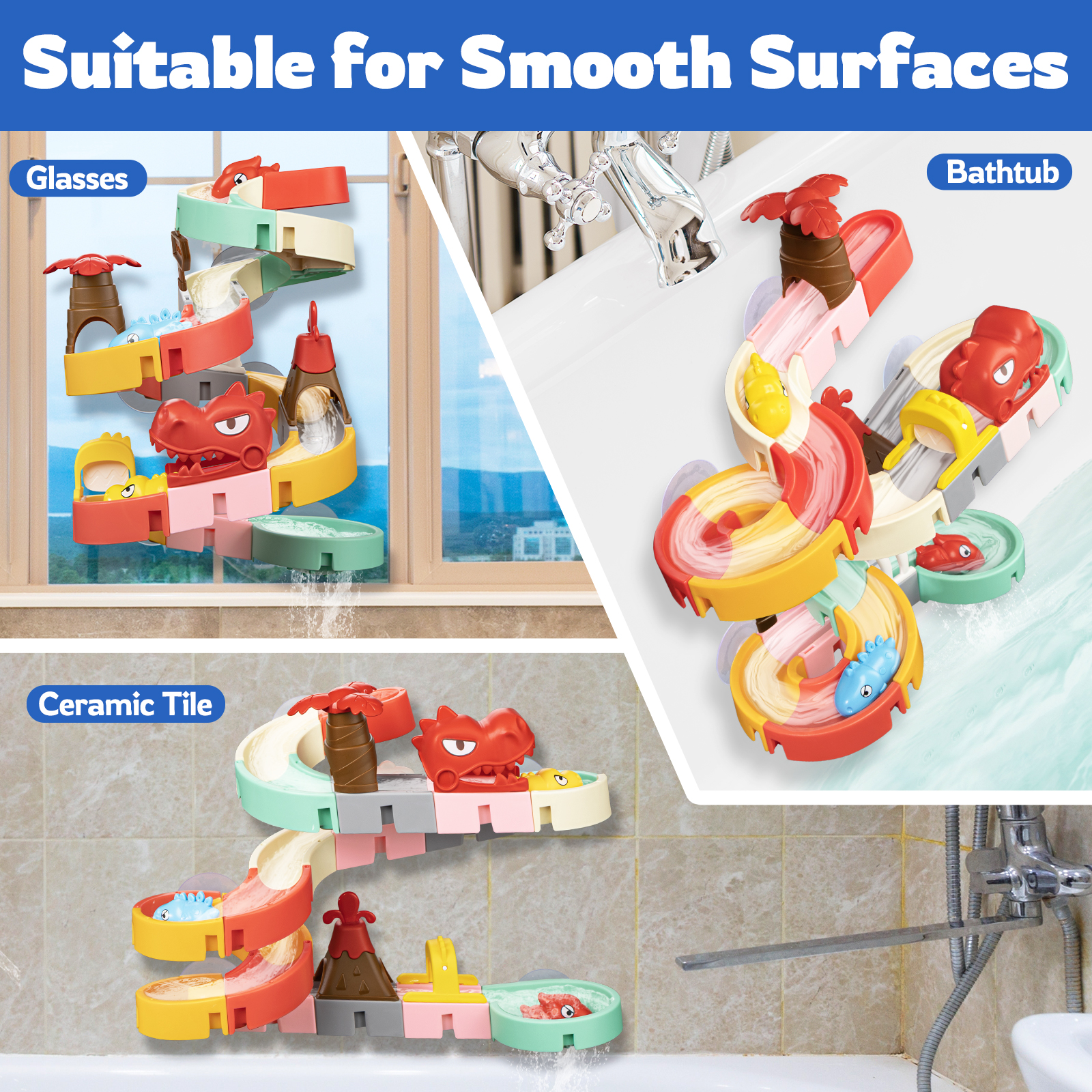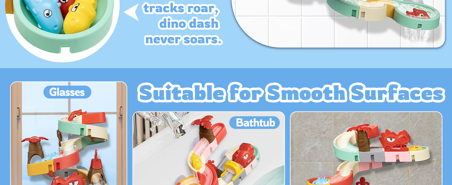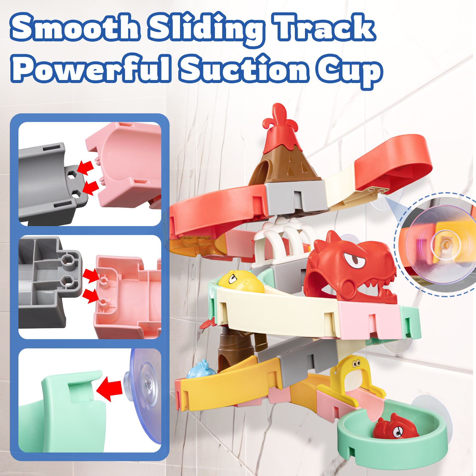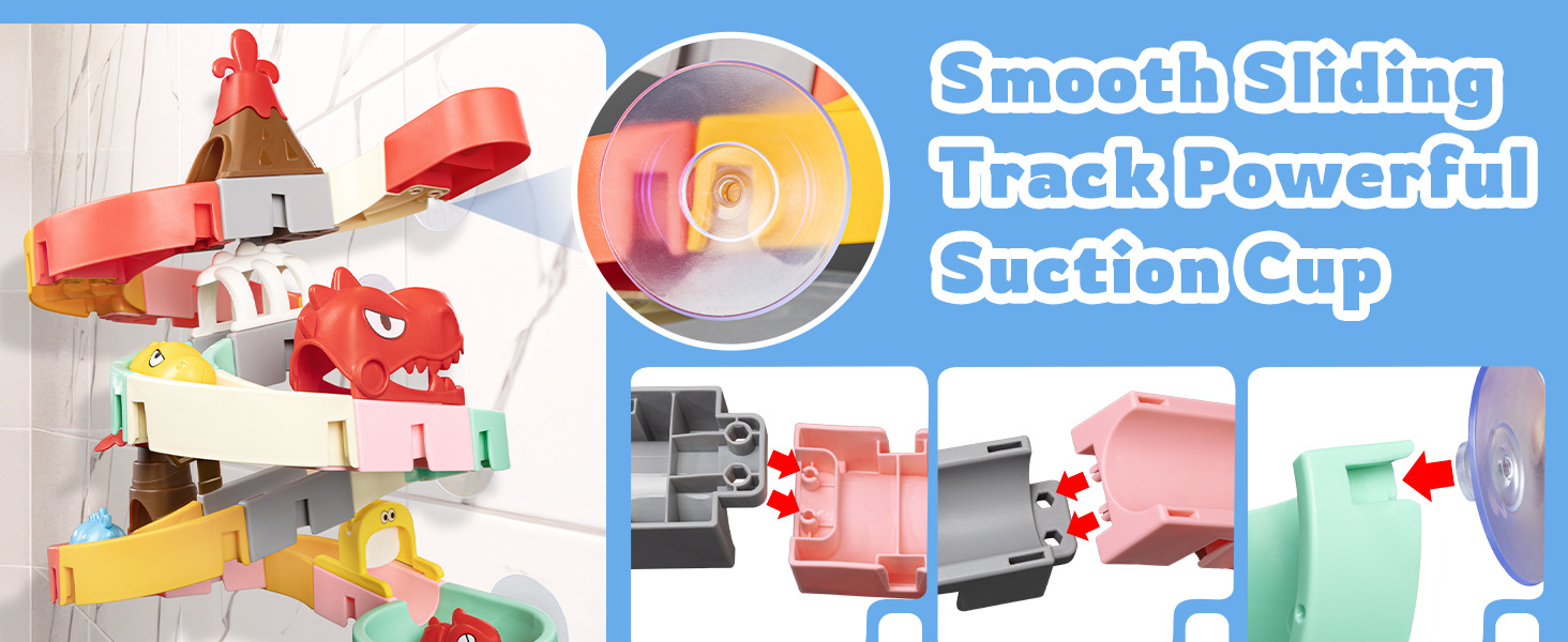 [DESIGN IT YOURSELF] There are 36 pieces in this bathtub toy set, including the suctions and the dinos. Yet you can design the tracks in many turns or straight, up or down, left or right. Do it with your imagination! Creative bath toys for toddlers age 3+