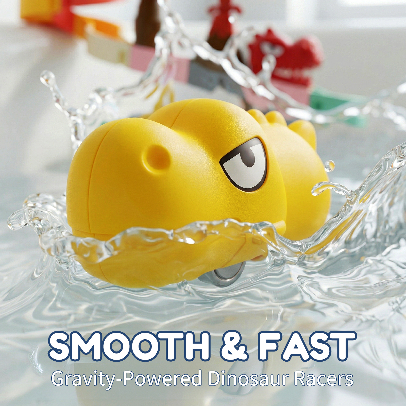 [SLIDING DINOSAURS] with Stainless Steel. Here you have 3 dinosaurs in different colors. You can use them to slide on the tracks you designed, just like marble run. Place them in the tub or wherever your kid wishes to play