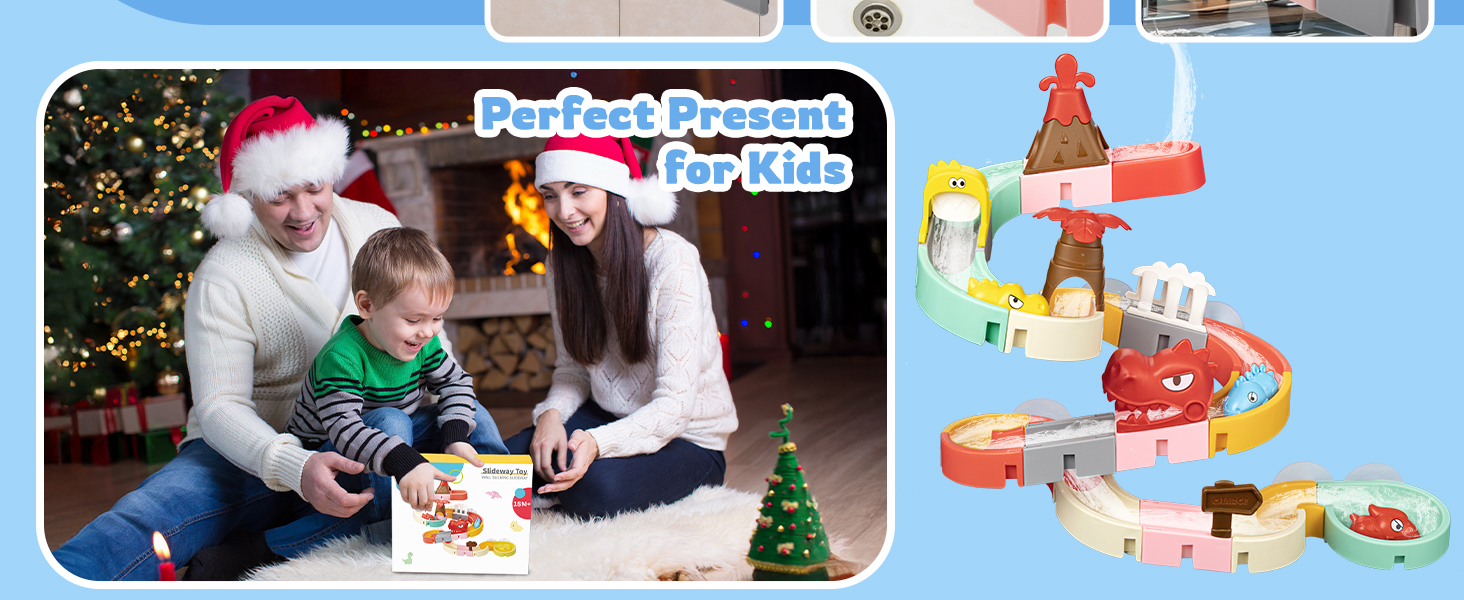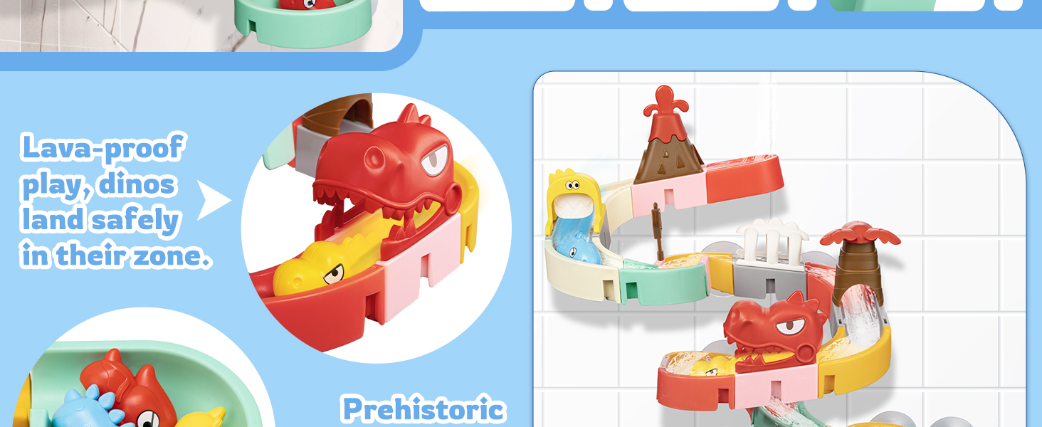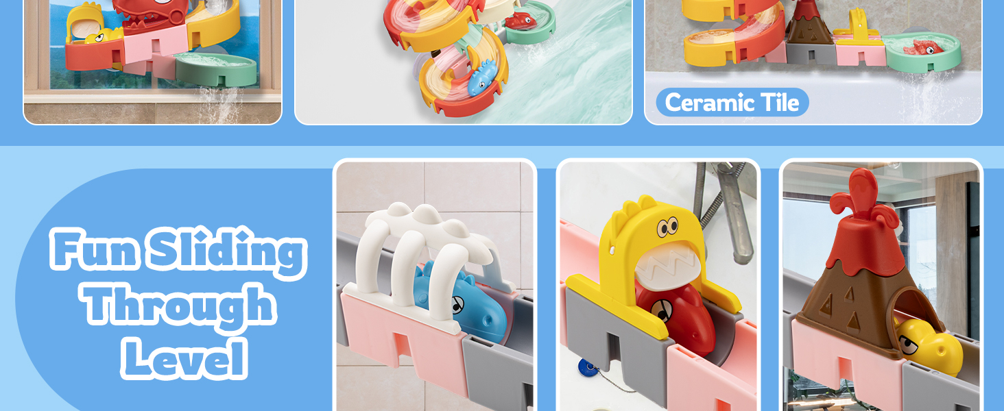 [DINO SLIDE BATH TOYS] To build up such a toy on the wall of the bathroom, it needs your kid’s concentration. The work of designing a wall track will help your toddler to focus. Bath time becomes happier and fast