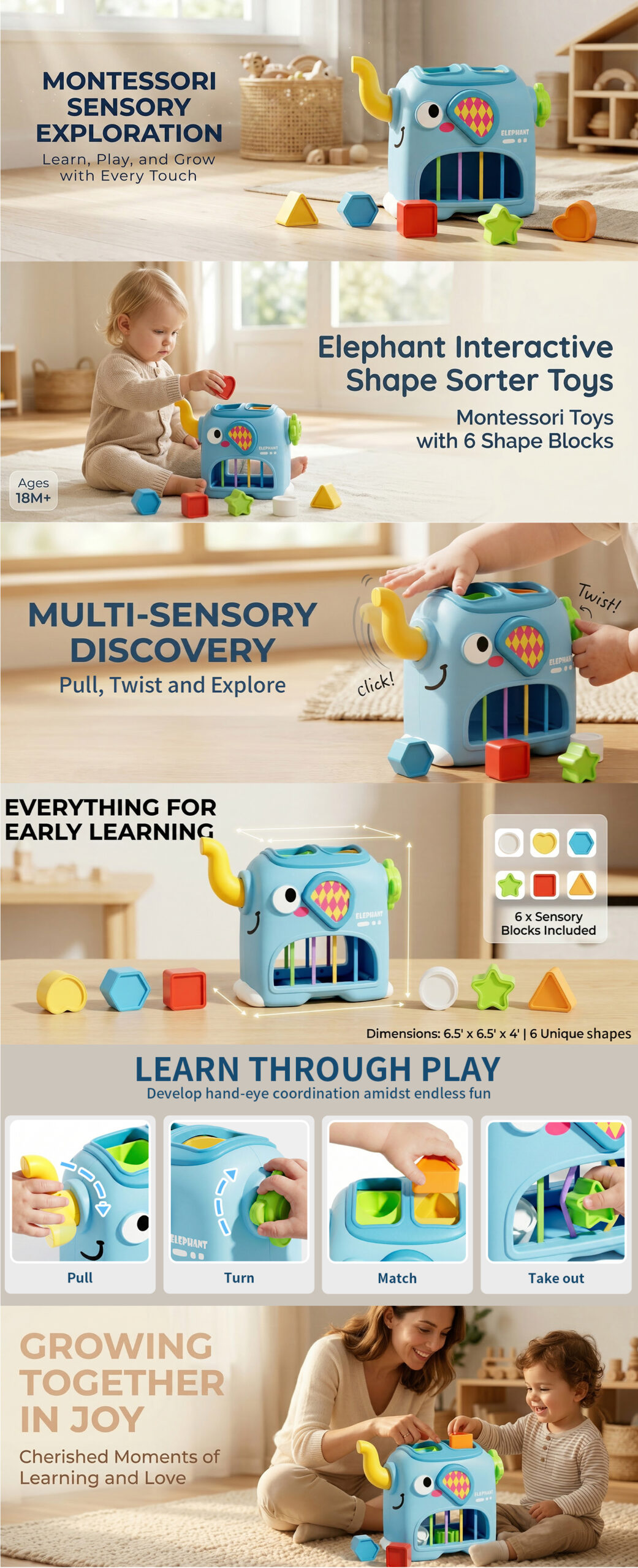 SOCBTNSO Elephant Interactive Shape Sorter Toys for 18 Months+, Montessori Matching & Sorting Toys with 6 Sensory Shape Blocks, Developmental Infant Birthday Gifts for Learning Toddler
