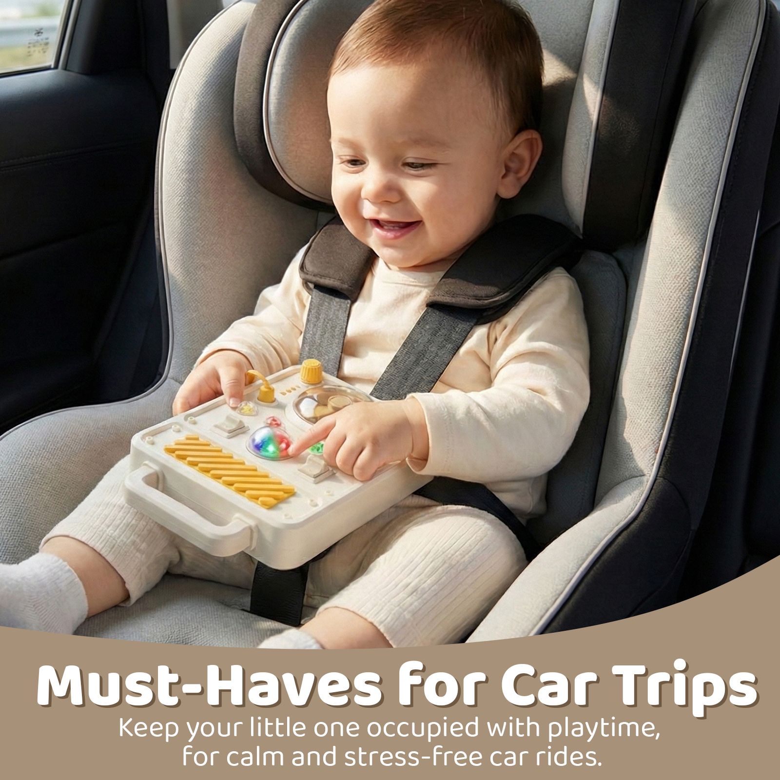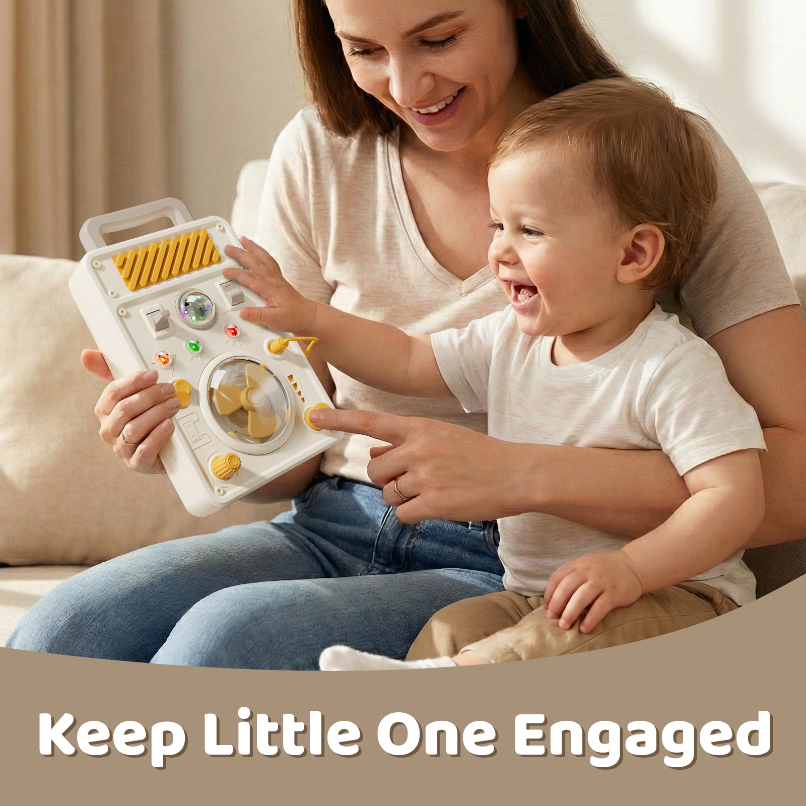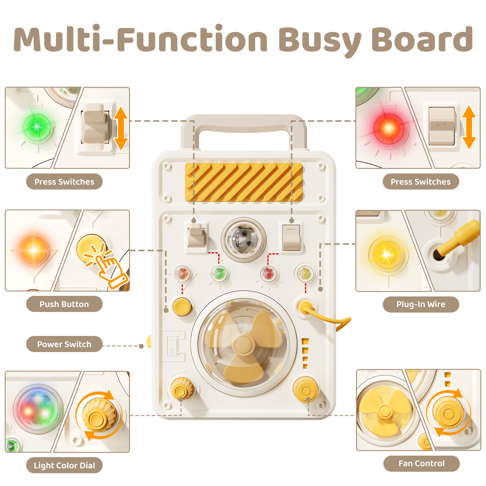 - 【All-in-One Activity Center】 Forget single-function toys! This baby busy board packs 5 engaging activities into one compact station: light-up buttons, multi-switches, insert-and-glow ropes, a color-changing orb, and a speed-control fan. It offers endless sensory exploration, keeping toddlers 2-4 engaged for hours and reducing screen time