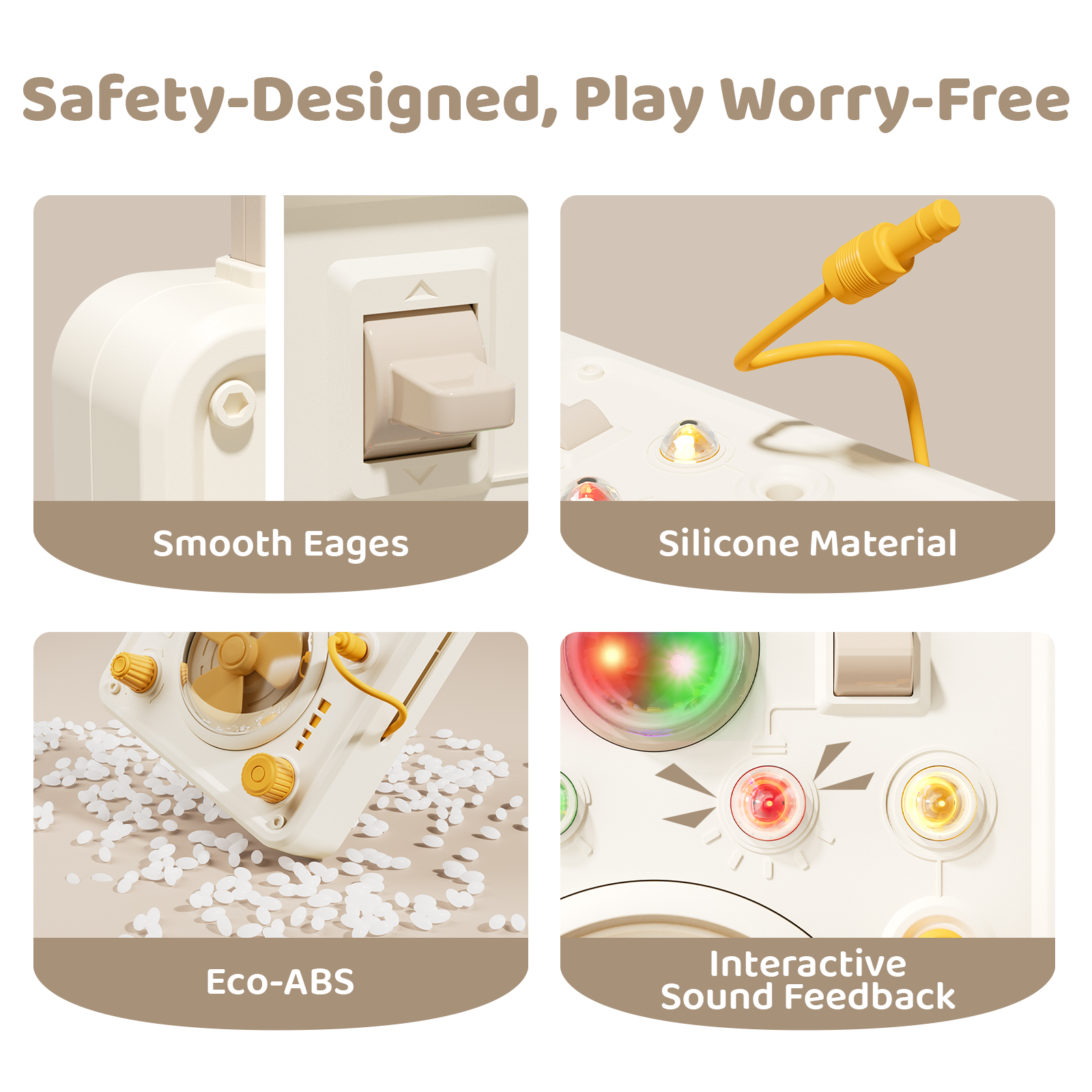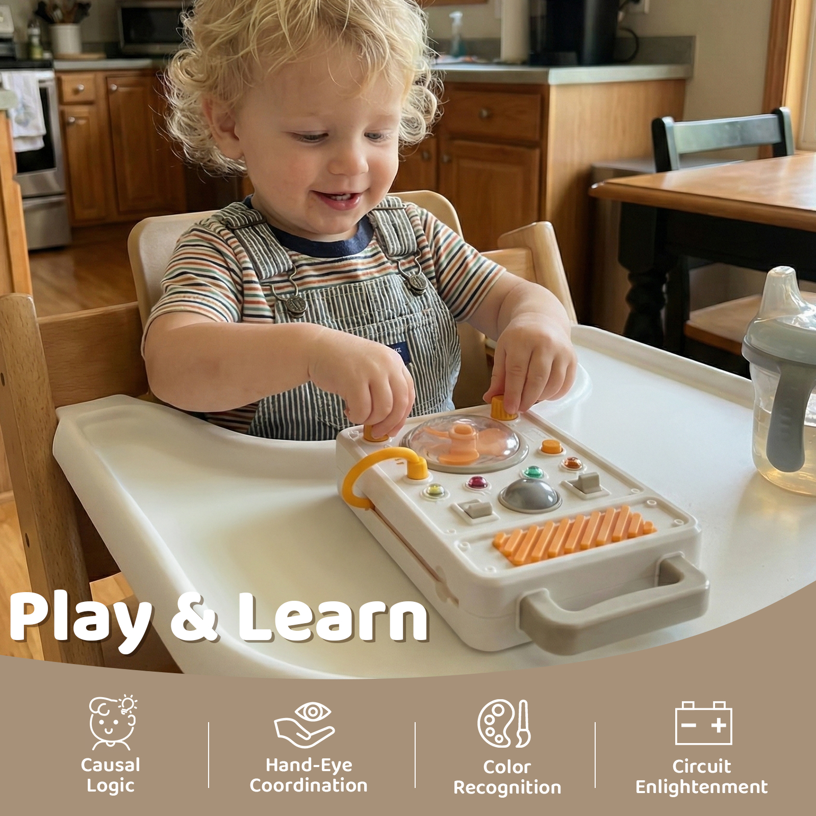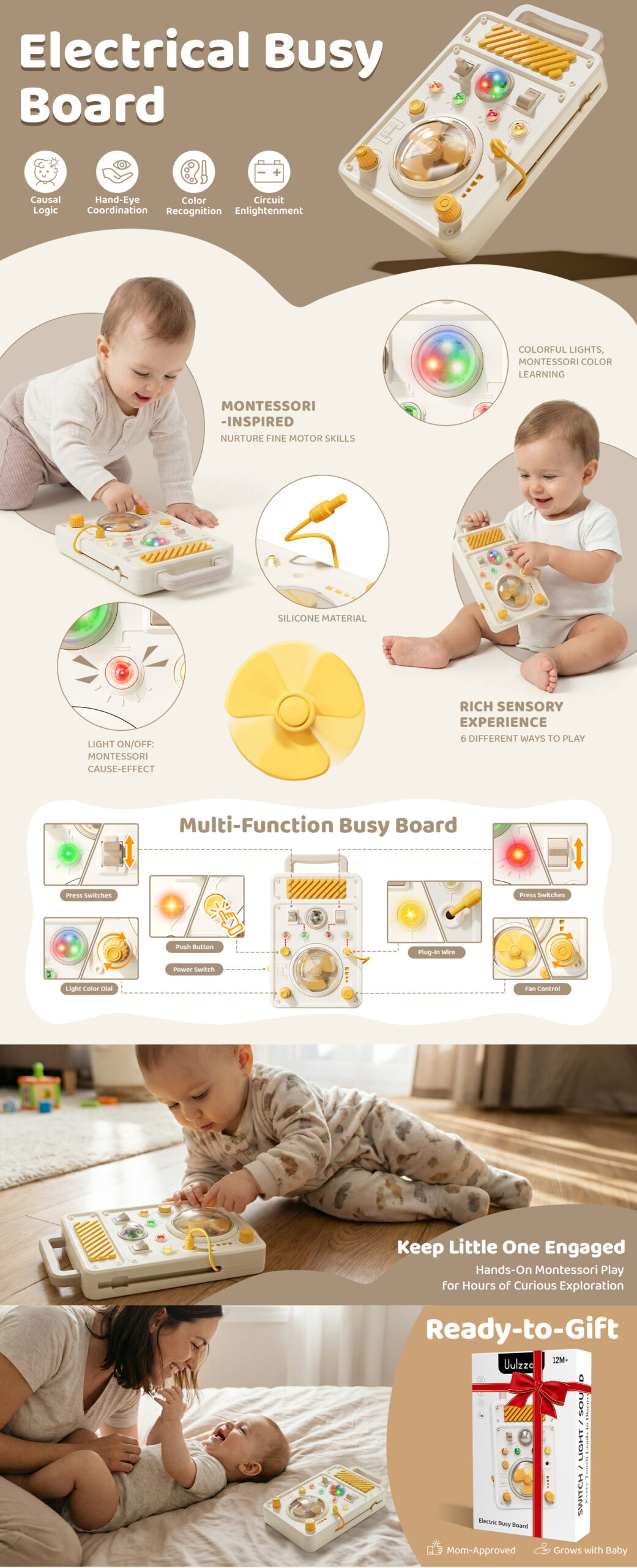 - 【Interactive Electronic Busy Board – Lights, Sounds & Action】 Spark curiosity safely! This toddler busy board comes alive with battery-powered interactivity. Press buttons for orange lights, flip switches for red and green LEDs, insert the soft rope for a yellow glow, twist knobs to change light colors and control fan speed. It perfectly satisfies a 1-3 year old’s fascination with real-world electronics in a child-proof way